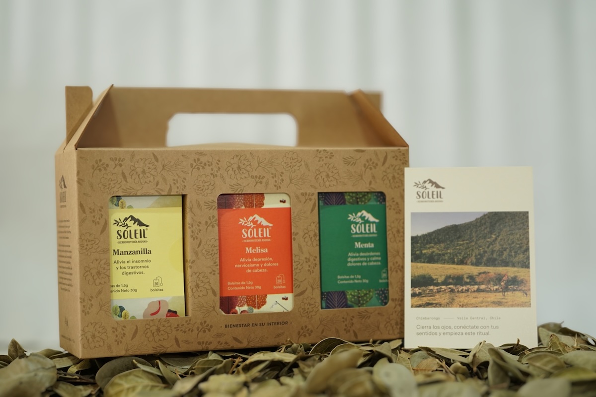 Maleta de cartón con tres cajitas (Dulces Sueños, Mix de Hierbas y Detox Purifica).